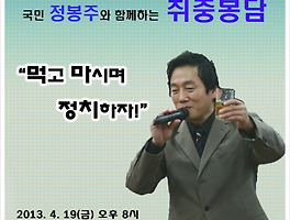 | [4월 19일 금요일 8시] 먹고 마시며 정치하자! 국민 정봉주와 함께하는 취중봉담!! (0) | 2013.04.16 |